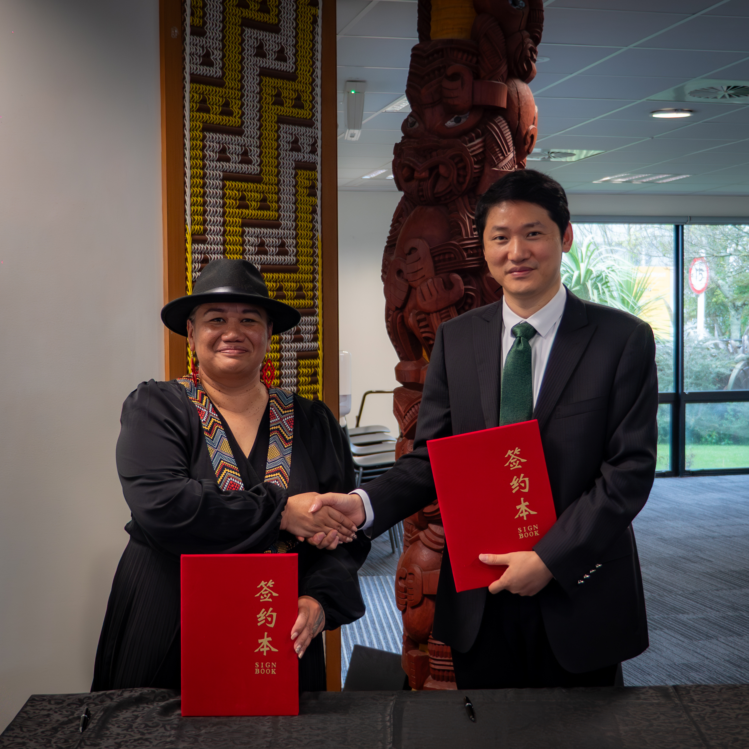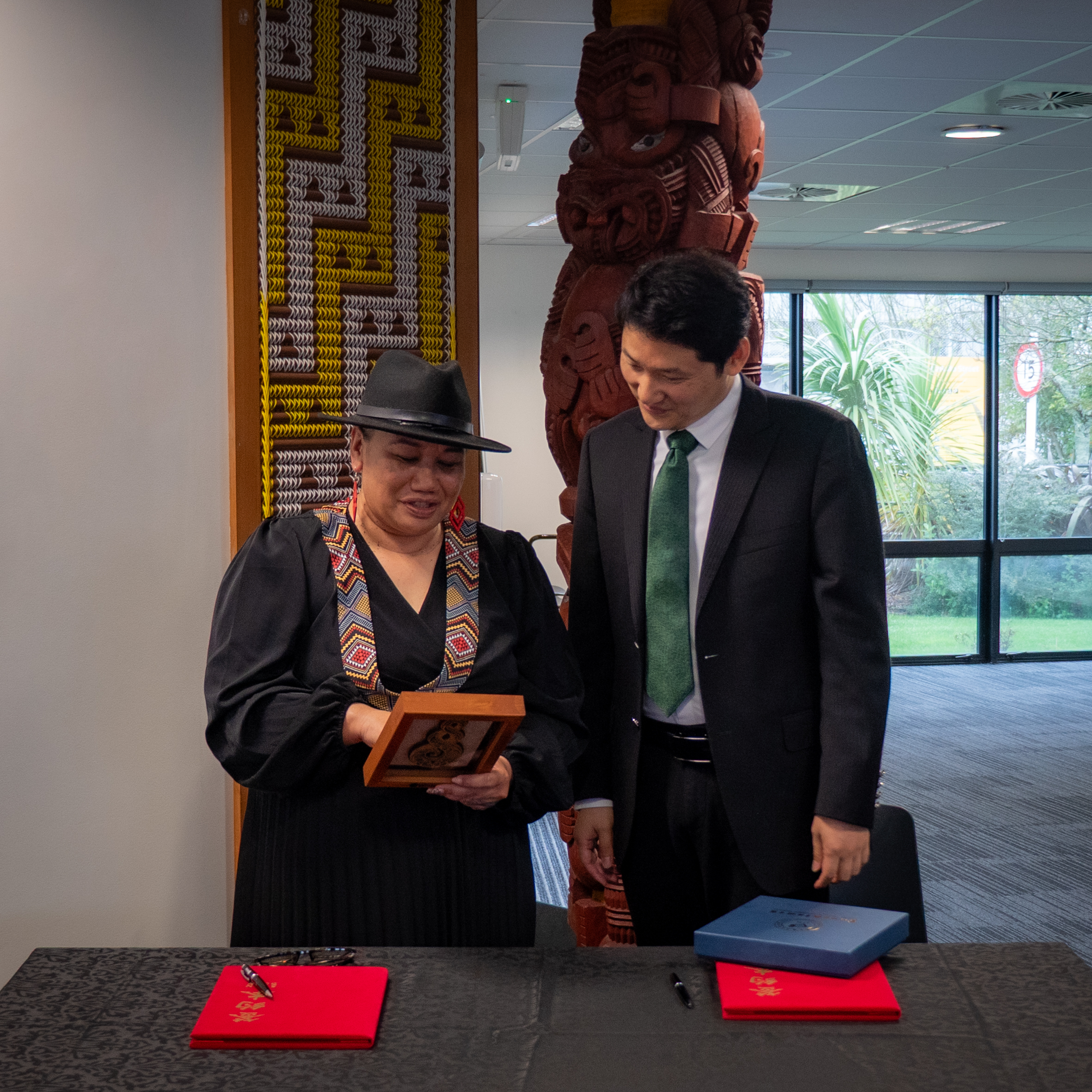 Dr Te Urikore Biddle, Wintec Executive Director – Strategy, Performance, and Enterprise and Tao Dawei, CCIT Vice President, following the signing of the MoU at Te Kōpū Mānia o Kirikiriroa Marae.
